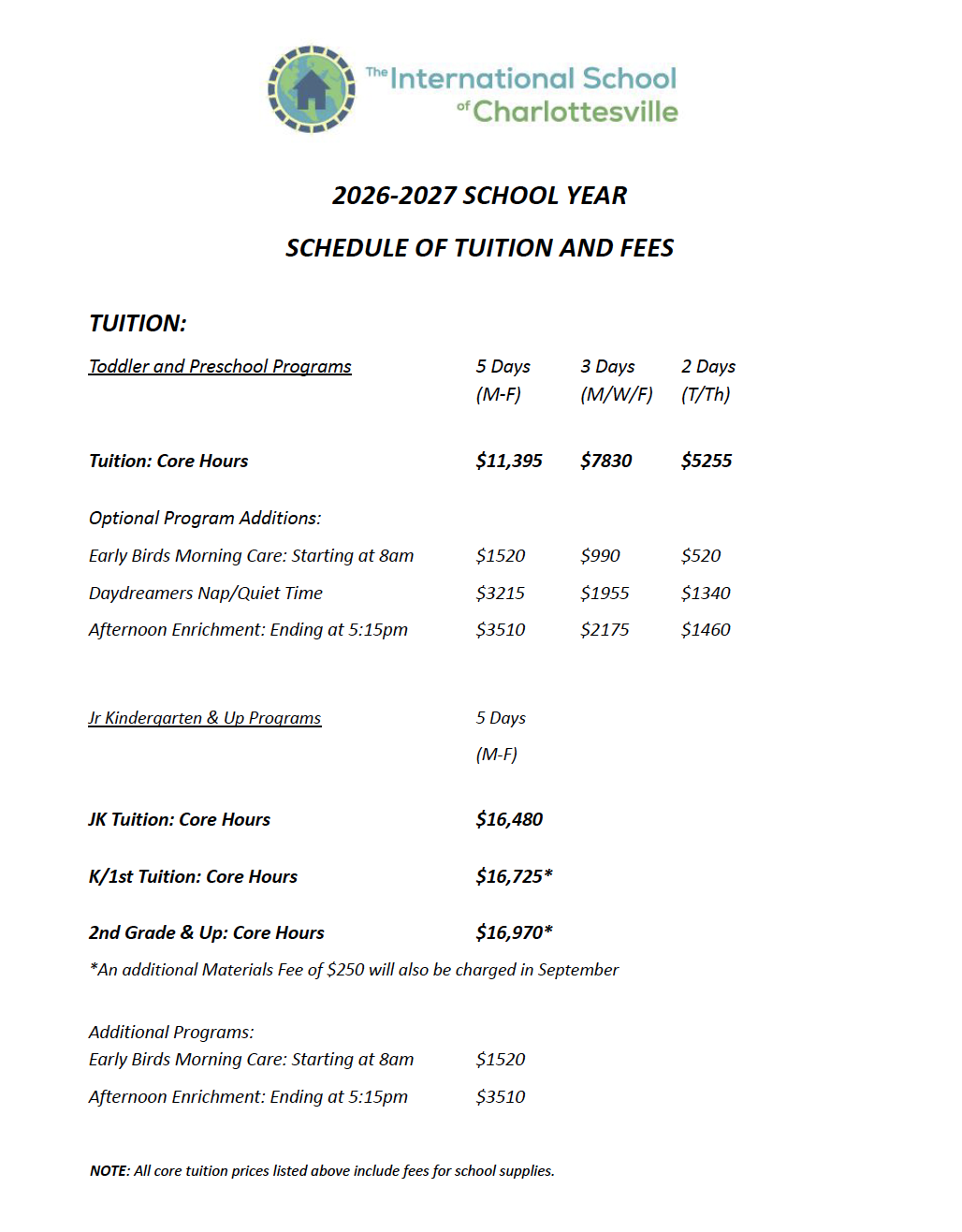 Tuition may be paid in full, paid in two equal installments (August and January), or paid over ten equal installments beginning in August. The ISC uses an early-childhood education application called Brightwheel to process payments for families who pay in installments and for families who choose to pay tuition by credit card. Documentation is provided by the school each calendar year for tax purposes.